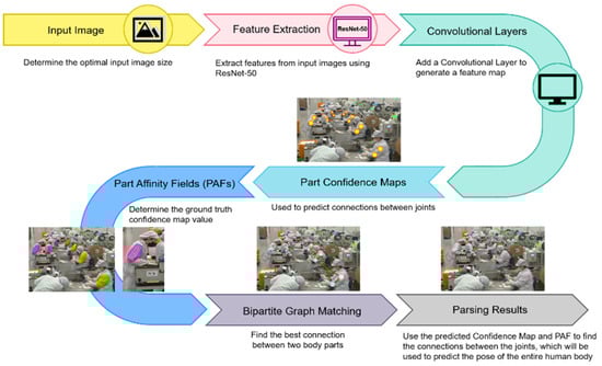 Among these various multi-person estimation algorithms, we chose OpenPose for the following reasons: One of the objectives of this research is real-time pose estimation. OpenPose is known to be an algorithm that provides highly accurate real-time estimation []. Therefore, we chose OpenPose because it can estimate the pose of a field worker in real time and provide stable results. Moreover, OpenPose is already a widely used and validated algorithm in a wide variety of research and application areas []. Finally, as mentioned in the title of this paper, we used ResNet-50 and integrated it with OpenPose for real-time pose estimation. OpenPose is a flexible algorithm that can be used with various neural network architectures, while ResNet-50 is a neural network architecture that achieves excellent performance in image classification and feature extraction tasks []. Therefore, by combining the excellent feature extraction capabilities of ResNet-50 with the multi-human pose estimation capabilities of the OpenPose algorithm, we were able to perform multi-human pose estimation in real time.