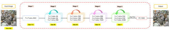 where x is the input and F(x) is the output after passing through the residual block. This structure allows the residual block to pass the input as it is and to learn with only the error or modified information. As mentioned previously, each stage in ResNet-50 consists of multiple residual blocks. A residual block consists of a series of convolutional layers, batch normalization, and activation functions, and it must be designed so that the inputs and outputs have the same dimensionality. Therefore, if necessary, a dimensionality-matching transformation can be performed using a 1 × 1 convolution. ResNet-50 uses these residual blocks to construct a network, starting from the input layer and continuing to connect the output layer through five stages; through this structure, a deep network can be built as shown in Figure 2, which has better performance than other previous network structures. In a typical deep learning model, when passing the input data through multiple layers to the output layer, the information may be continuously changed and lost; by contrast, in the shortcut connection, the input data are directly connected to the output layer even in the middle layer of the network, which prevents loss of information on the input data, which plays a major role in determining the performance of the model.