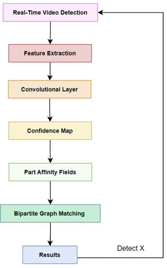 The operation flow of this method consists of Real-Time Video Detection, Feature Extraction, Convolutional Layer, Part Confidence Maps, PAFs, Bipartite Graph Matching, and Results (Real-Time Field Worker’s Pose Estimation), as shown in Figure 3. Moreover, if the pose is not detected, it returns to the Real-Time Video Detection step and starts over.