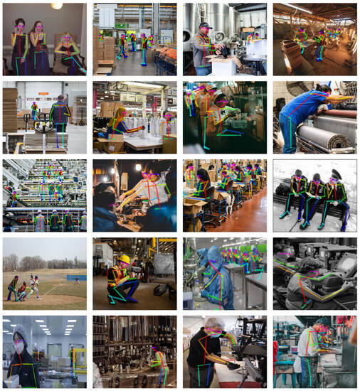 In this paper, we evaluate our proposed method using three benchmarks. First, the MPII Human Multi-Person dataset, which consists of 3844 training and 1758 test groups and contains images of multiple people interacting with 14 body parts in highly detailed poses []. Second, the COCO keypoint challenge dataset is a dataset that requires the detection of 17 keypoints (body parts) for each person [,]. Finally, the Field Workers dataset, which we built in this thesis, consists of a subset of 15,000 annotations from the COCO keypoint dataset and contains a variety of scenarios that occur in real-world workplaces. These datasets are used to solve problems in different scenarios and were utilized to evaluate the performance of the proposed method. According to the authors’ previous research, these benchmarks have shown different image processing speeds and accuracy [,]. In addition, these datasets collect images covering a variety of real-world problems and include different scenarios such as crowding, scale variation, occlusion, and contact. We have experimentally demonstrated that the method proposed in the paper works effectively in real-world applications, and these benchmarks demonstrate the results compared to the existing OpenPose, AlphaPose, and DensePose as mentioned in the paper. In addition, Figure 4 shows the qualitative results of the algorithm.