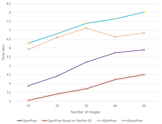 Image processing time is an important factor in real-time pose estimation techniques. Figure 5 presents the results of measuring the time each model took to process a given set of images. The algorithms used for comparison are the traditional OpenPose, AlphaPose, and DensePose. AlphaPose is a computer vision algorithm that specializes in multi-person recognition and pose estimation, while recognizing multiple people in an input image or video and estimating the body parts and joint positions of each person. It ranks first on the MPII dataset [] and shows high performance on the COCO dataset [], and it is based on YOLOv3, which is an algorithm that provides both high speed and accuracy []. DensePose is an algorithm that divides the human body into fine-grained units through density-based segmentation and estimates the pose at each unit, while it also generates a high-resolution pose map by estimating the exact position and orientation of human body parts in the input image. It has the ability to map each human pixel in an RGB image to a 3D surface, and it is an algorithm that can be used to solve the problem of segmenting parts and instances within an object []. In our experiments, we measured the processing time of each model when 10, 20, 30, 40, and 50 images were input. OpenPose based on ResNet-50 showed respective image processing times of 3.05 s, 3.41 s, 3.7 s, 4.22 s, and 4.5 s. On the other hand, the image processing times for traditional OpenPose were 3.87 s, 4.42 s, 5.2 s, 5.73 s, and 5.9 s, respectively; those for AlphaPose were 5.92 s, 6.6 s, 7.12 s, 6.63 s, and 6.85 s, respectively; and those for DensePose were 6.21 s, 6.81 s, 7.39 s, 7.64 s, and 8.02 s, respectively. Taken together, the average image processing time for ResNet-50-based OpenPose is 3.78 s, while the average image processing times are 4.84 s for traditional OpenPose, 6.16 s for AlphaPose, and 7.37 s for DensePose. From these results, we can see that OpenPose based on ResNet-50 has a faster image processing speed than other pose estimation algorithms.