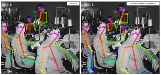 We also used ResNet-50 instead of VGG19 for the following reasons: VGG19 and ResNet-50 are both models that are often used in common computer vision tasks. However, ResNet- 50 can sometimes outperform VGG19. ResNet-50 is composed of deep neural networks and can perform well when used with deeper networks because it can solve the gradient vanishing problem by introducing residual connections [,,]. Therefore, we chose ResNet-50 instead of VGG19 because ResNet-50 is expected to achieve higher performance. ResNet-50 is also a lighter model than VGG19. Although ResNet-50 has 50 layers, it has the advantage of having a relatively small number of parameters. This can reduce computational resources and memory usage, which is beneficial for resource-constrained tasks such as real-time pose estimation. Therefore, ResNet-50 provides greater speed and efficiency when performing real-time tasks such as real-time pose estimation. Finally, ResNet-50 is compatible with OpenPose []. OpenPose is a comprehensive solution for multi-person pose estimation, and we chose ResNet-50 for our study because it allows us to easily take advantage of the various features of OpenPose for pose estimation tasks.