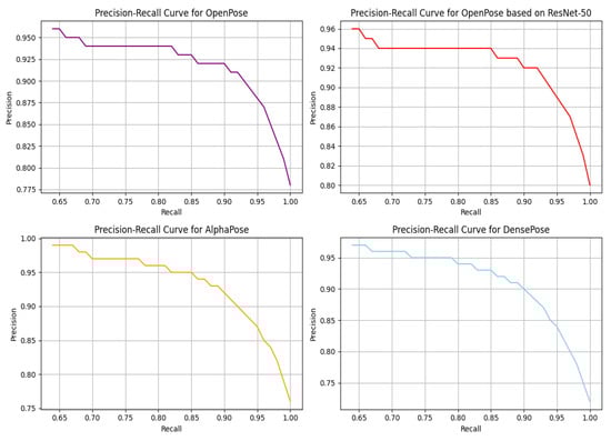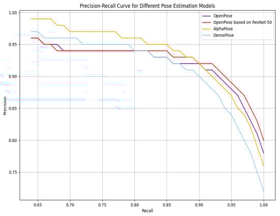 In addition, through the Precision–Recall curve graph, Figure 7, is the Precision–Recall curve graph of each model, and Figure 8 is the combined Precision–Recall curve of each model. From these graphs, we can clearly see that OpenPose based on ResNet-50 has higher Precision and Recall values than other models. Precision is a measure of the percentage of results predicted to be positive that are actually positive, while Recall is a measure of the percentage of true positives that are correctly predicted to be positive. Therefore, high Precision and Recall values mean that the model correctly predicts positives and misses fewer positives. This indicates that OpenPose based on ResNet-50 provides better performance as a real-time pose estimation technique.