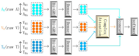 As shown in Figure 1, after the original data are extracted by different methods, they are input into the recurrent neural network, and the output results are multimodally fused using the complex attention mechanism layer. The workflow of the complex attention mechanism is as follows: First, linearly transform the input tensor X and map it to three tensors: query, key, and value. Next, the Q, K, and V tensors are divided into simple attention heads and complex attention heads, and the number of each head is set to 2. Specifically, each tensor is divided into simple attention heads and complex attention heads. In the next step, the attention weights are calculated for the simple attention head and the complex attention head.
