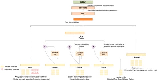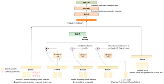 Therefore, this study uses the DIN model to complete the pattern recommendation of the prior knowledge base and improves it. The structure of the DIN model is shown in Figure 2. The input of this model is the original data collected by the seismic monitoring equipment and the prior model, and the output is the predicted time series.