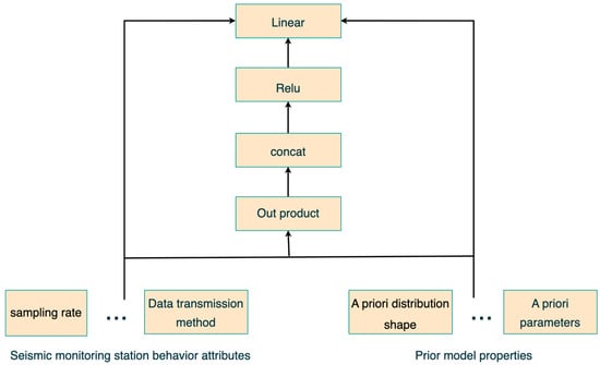 Then, the embedding vectors e , related to the seismic station configuration, behavior, and prior model descriptive attributes, are fed into a deep neural network. The forward process is shown in Equation (8):