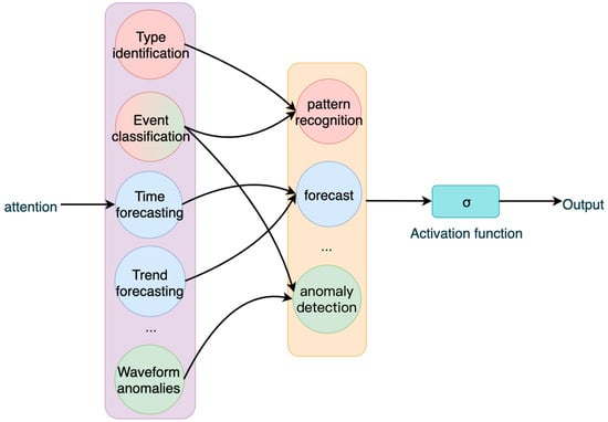 In this part of the attention mechanism module, the embedded station behavior attributes are connected with the candidate prior model attributes. There is a weight between the embedding vectors of each feature field, which indicates the degree of association between the two features. All the association weights can form a station behavior–prior model attention score matrix P. An attention score matrix P is generated under a specific attention head h, which represents the correlation between each feature and other features, as shown in Formula (5):