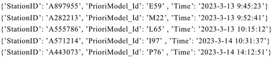 The dataset used in this paper contains two subsets: the station behavior dataset “Stations_data.txt” and the priori model dataset “PrioriModel.txt”. The label style in the station behavior dataset is as follows: StationId|PrioriModel_Id|Time, which includes the station’s ID, the priori model ID it called, and the timestamp of the call. The priori model dataset is primarily used to record basic information about the priori models, with a list style as follows: |PrioriModel_Id|PrioriModel_Type|. The data formats for the two datasets are defined, as shown in Figure 7 and Figure 8. The meanings of each field are as follows: