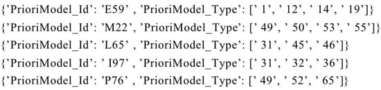 • PrioriModel_Type: The type of the model, with the numbers in the array, indicates a progressive relationship. For example, in Figure 8, the prior model with ID “E59” and model type represents the historical data pattern–trend prediction.