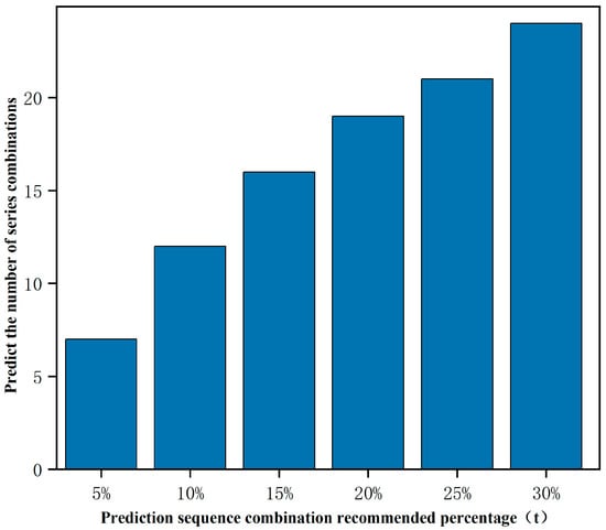 Firstly, looking at the average accuracy growth trend in Figure 10, when the value of t is greater than 25%, the growth of accuracy becomes more gentle, so the range of values can be reduced to within 25%. And the accuracy grows larger between 5 and 10%, and in combination with Figure 11, it can be stated that within this range the types of recommended sequences will see a substantial increase. However, when the value of t is more than 20%, the speed of increase in sequence combination diversity begins to slow down, indicating that the impact of the increase in t value on sequence combination diversity begins to diminish. But when t is less than 15%, the number of recommended sequence combinations is too few to meet the functional requirements of the stations. Therefore, overall, it is reasonable to set the value of t in the range of 15–20%.