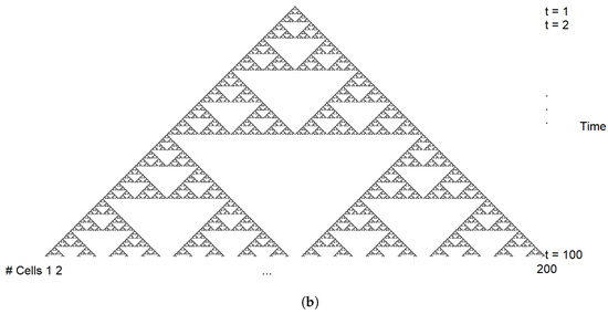 Every cell is initialized, and its state evolves synchronously in discrete time steps. Therefore, in every time step, all the cells update simultaneously their state. Calculating a cell’s new state depends on a rule f. This state update rule f takes into account several parameters, such as input from other cells, the cell’s neighbors as described in the previous paragraph; inputs from the environment as well as taking into consideration its own state, and depending on the relationships dictated among the neighboring cells by the rule, the new cell state is computed. As an example, we have Elementary CA (ECA) Rule 90, where each cell updates its state, taking into account the current state combination of its Right R and Left L neighbors as well as its current state ( cell C). The input combinations define the rule truth table, as shown in Table 1, and the central cell’s C next state can be computed. The notation chosen for ECA rules is based on Wolfram’s notation introduced in [53], where all transition rules f are encoded to numbers ranging from 0 to depending on the binary representation of the rule’s outcome set. As an example, in the case of Rule 90, the outcome set is , which translates to . The Boolean logic function describing the rule can be calculated, as shown in Equation (5), and its evolution is shown schematically in Figure 2a. In this case, the rule’s evolution is a repetitive pattern, as seen in Figure 2b, but there are also rules whose evolution indicates a random behavior.