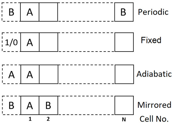 Lastly, what needs to be defined is how the boundary cells, which are missing some of their adjacent cells, are handled. There are multiple boundary conditions options available, but the most common ones are periodic, fixed, adiabatic, and mirrored, as shown in Figure 3. Taking as an example the case of ECA, where the two boundary cells, (), are both missing one adjacent cell, depending on the boundary conditions, Table 2 shows which cells affect the two boundary cells. The next state of the first cell is computed as a function of its current state , its Right R neighbor’s state , and its Left L neighbor’s state, considering 4 different cases for this neighbor, depending on the applied boundary conditions. Therefore, in the case of periodic boundary conditions, the last cell is used as the Left neighbor. Fixed boundary conditions translate as the use of a fixed value of either 0 or 1 as the missing neighboring cell, while adiabatic boundary conditions copy the cell’s under examination (here ) state to the missing neighbor’s state. Finally, if mirrored boundary conditions are selected, the Left neighbor’s value is selected to be the same as the Right neighbor’s, here equal to . Having explained the case for cell , the same rules can be applied to the last cell to compute the Right neighbor’s state that will be used in each case of different boundary conditions. For all other cells , where and , their next state is a function of their Right and Left neighbors, which can be summarized as follows, . These cases can be generalized for all N-dimensional CA grids.