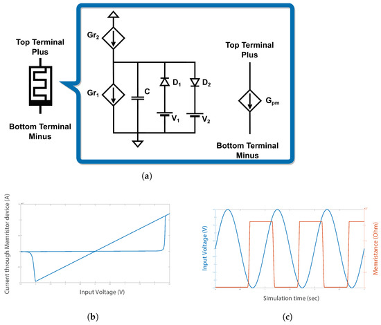 The model presented in [83] is a behavioral memristor model of a threshold-type voltage-controlled memristive device. The memristor’s switching is affected by the quantum tunneling distance modulation [84] used as the main electronic transport mechanism. The model is composed of an ohmic variable resistor R connected in series with a variable resistor . The model focuses on metal-oxide memristor devices; thus, R represents the resistance of the doped dioxide layer that has conductive properties, while represents the tunneling resistance of the undoped layer acting as a pure insulator. Given that , the model focuses mostly on . This resistance is affected by both the tunnel barrier width as well as the oxygen deficiencies transport resulting from the movement of the boundary that separates the two materials. Appropriately tuning the model’s parameters leads to the conclusion that the model can be fitted to numerous fabricated memristive devices while retaining the characteristic memristive fingerprints. In order to make it available for circuit designers, this model has also been implemented as a subcircuit in through a simple netlist consisting of existing electronic elements, as shown in Figure 4a, where the memristive device subcircuit consists of two current sources and an integrating capacitor. Handling the boundary conditions is realized using one more current source and direct current voltage sources connected in series with diodes. In Figure 4b, the model’s behavior is presented and specifically its I-V curve as well as the device’s memristance change in response to the applied voltage at its terminals (Figure 4c).