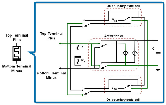A circuit realization of the GBCM model using the software, inspired by [89] was also presented and is shown in Figure 5. Modeling the memristor’s state required measuring the voltage across a capacitor C. Next, there is the series connection of two resistors, the linear resistor R and the non-linear, voltage-controlled one, . As the model’s mathematical description dictates, the boundary conditions of the model need to be set and this is achieved through the set of identical boundary cells. Each boundary cell is made up of two voltage-controlled switches whose functionality is to be activated/deactivated when the voltage across the capacitor reaches its bounds/surpasses the activation threshold. Furthermore, the activation cell consists of two voltage-controlled switches and two current controlled current sources. This configuration is used to model the memristor’s transition from the on to the off state and vice versa depending on the voltage applied to the memristor’s terminals.