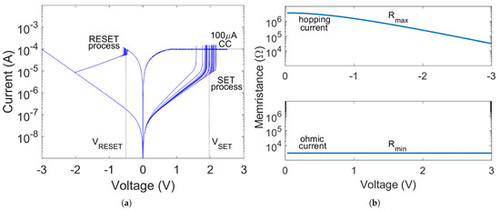 (a) I−V simulation results for 20 cycles with the default variability applied, using a 400 s- period triangular voltage pulse from −3 V to 2.5 V and a 100 A compliance current for the SET process. (b) Boundary states and as a function of the applied voltage across the memristor (without variability), illustrating the conduction modes in HRS and LRS states. corresponds to and corresponds to . Adapted from [90].