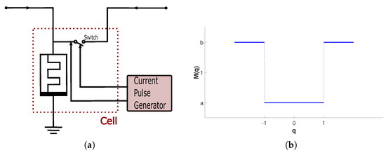 In 2009, M. Itoh and L. Chua proposed a Memristor Cellular Automaton (MCA) for the first time [91]. An MCA is a rectangular array comprising identical memristor-based cells connected to each other via identical interconnections. Each cell consists of a passive memristive device and a switch, as shown in Figure 7a. The memristor model used in this work is an ideal, theoretical model whose memristance is a function of the charge q flowing through it and the current flow , defined as , whose response is shown in Figure 7b and can be tuned accordingly depending on the desired behavior by appropriately selecting the desired a and b values of the function as shown in Figure 7b.