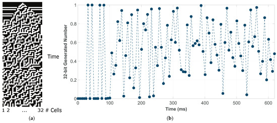 In order to generate pseudo-random numbers, the authors were based on the ECA rules classification made by Wolfram in [104], who suggests that Rules 30 and 45 are the most suitable rules for pseudo-random number generation. Therefore, in the proposed circuit, based on the design strategy described for Rule 126, Rules 30 and 45, whose Boolean functions are shown in Equations (10) and (11), respectively, were combined and alternating every three time steps yielding a random enough sequence to be unpredictable, based on the evaluation performed using MATLAB©. To test the sequence’s randomness, the method selected [105] is called the Runs Test. Each run is defined as a non-stop series of increasing or decreasing values. The run’s length is equal to the number of these increasing or decreasing values. When the set of values comprises random data, then the probability that the value is followed by a larger or smaller value follows the binomial distribution. The results of the MCA’s evolution are shown in Figure 11a, while the generated numbers in format are shown in Figure 11b.