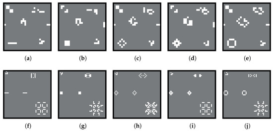 One of the most well-known applications of 2-D CA is the Game of Life (GoL), proposed in 1970, by the mathematician John H. Conway and publicly appeared in Martin Gardner’s Scientific American column [115]. GoL is a zero-player game, meaning it does not require any user input, and it evolves autonomously over time. All that needs to be specified in every cell’s initial state as well as the rule. Although a variety of rules have been proposed and tested, the most widely used and interesting one is the one described by Equation (12), which can result in the generation of complex patterns and be used to imitate the functionality of a universal Turing machine.