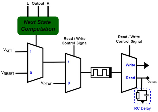 In this case, to fit to the required behavior, the Vourkas–Sirakoulis model was selected. The selection of a different model makes it necessary to appropriately modify the MCA cell in order to adjust the proposed circuit to the model’s requirements. These modifications include changing the connectivity of the switch that alternates between the and the phases, as in this case, the memristor model is voltage-controlled. Affecting a memristor’s state requires a voltage difference at its terminals whose value is high enough to exceed its voltage threshold and set or reset the memristor. On the other hand, sensing the memristor’s state without affecting it is done by applying a voltage of low enough value that is not capable of affecting its state but only reading it. Implementing these in the circuit requires grounding the memristor’s bottom terminal during the phase so that the voltage applied at its top terminal can affect its memristance when necessary, while reading it will connect its bottom terminal to the cell’s output in parallel to an RC delay circuit that will form a voltage divider. This was achieved using the switch as shown in Figure 9a. During its evolution, each cell of the MCA must receive a low-amplitude reading voltage pulse and also receive a resetting negative pulse to reset the memristor to its state so that it can be changed again depending on the rule, according to which writing voltage pulses will be applied to the cell when dictated by the rule. The reading pulse is only applied during the phase due to the grounding of the memristor afterward. An RC delay circuit is connected to the memristor’s bottom terminal, whose resistance and capacitance values were appropriately selected so as to maintain the output signal’s amplitude for a sufficient amount of time and be able to distribute it to the cell’s neighbors and affect their states. All the above as well as the signal used to initialize each cell’s state are global signals distributed to all the cells. Figure 9b demonstrates the cell’s output when its state is (red), (green) and the reading pulse duration (blue).