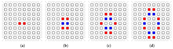 As mentioned above, a CA is a configuration of several dynamical units, the cells, whose local interconnections govern the system’s temporal evolution. In order to define a CA, we need to define its characteristics, the state update rule f, the neighborhood type, the available states as well as the boundary conditions. The cells are organized in a regular N-dimensional space, where . Each cell is characterized by its state , which can be any one of a set of possible cell states S, as selected depending on the specific application. Each cell’s state is evolving in discrete time intervals, called time steps, as specified by the state update rule f. This can be generalized to include any number of possible states; therefore, , where M is the number of available states under the conditions that and .