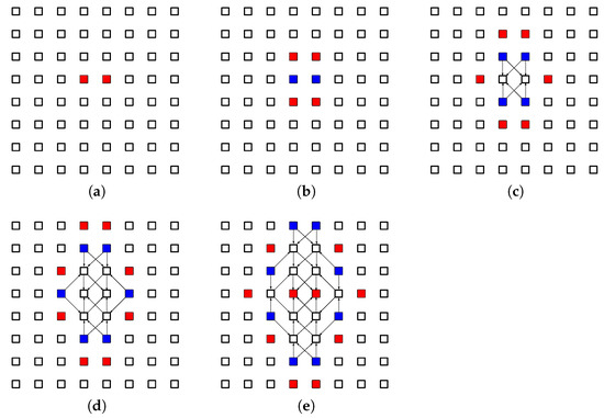 In the case of two-dimensional CA (2-D CA), the most common neighborhood types are the von Neumann and Moore neighborhoods. The former includes the cell’s four adjacent neighbors (North N, South S, East E, West W), shown in gray in Figure 1b, while the latter includes, in addition to the von Neumann neighborhood, the cell’s four diagonal neighbors (Northeast , Northwest , Southeast , Southwest ), as shown in Figure 1c. Equations (3) and (4) express these relationships mathematically and show the interactions between the respective neighbors.