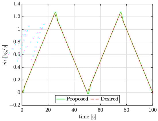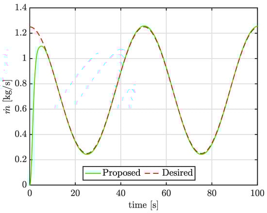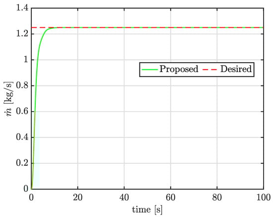The first scenario (i.e., Scenario I) presents the evaluation of the developed nonlinear controller to maintain the mass flow rate at a constant level. To study this, we considered a constant trajectory (i.e., m ˙ d = 1.25 ), and the objective is for the controller to generate the appropriate control actions that minimize the tracking error.