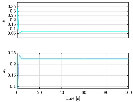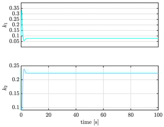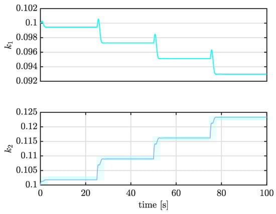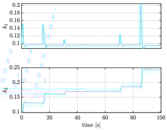 Figure 12. The calculated control gains for the system in time-varying trajectory tracking in Scenario III (time-varying increasing and decreasing of the mass flow rate).