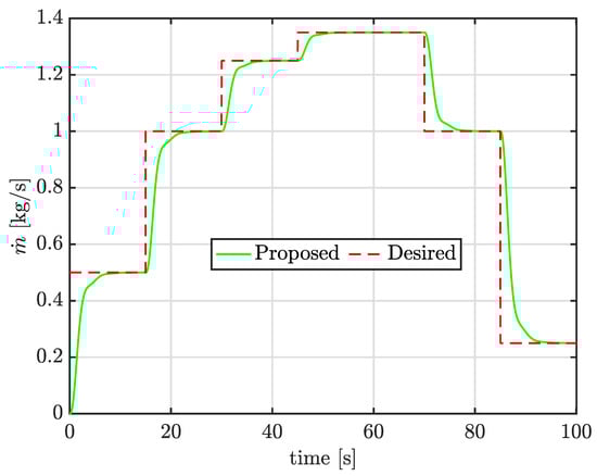 Figure 6 shows the desired output and the actual output of the system under control for a step-wise trajectory considered in the second scenario. Figure 7 plots the generated control action for the system considering step-wise trajectory tracking in Scenario II. It is shown that the controller is successful in generating the appropriate control actions that minimize the tracking error. This clearly illustrates that the system output reaches the desired reference in a very short time with no overshoot. It also successfully increases and decreases the mass flow rate in response to immediate changes. This demonstrates that the mass flow rate can be increased/decreased and kept at a certain level using the developed nonlinear controller. The generated control action is smooth and stable, which results in a smooth throttling process.