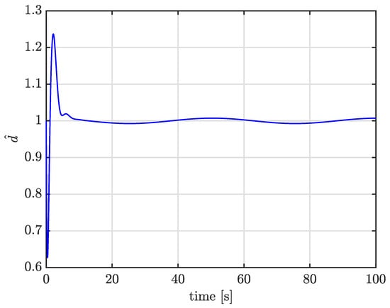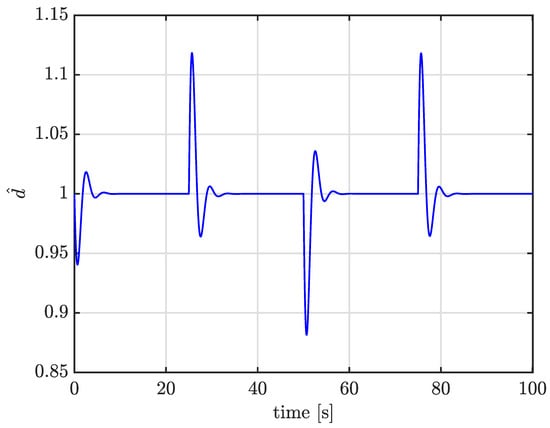 The calculated control gains (i.e., k 1 and k 2 ) and the estimated disturbance (i.e., d ^ ) for the system in a nonlinear time-varying trajectory tracking in Scenario IV (i.e., nonlinear time-varying increasing and decreasing of the mass flow rate) are shown in Figure 16 and Figure 17, respectively. Figure 16 shows that both control gains (i.e., k 1 and k 2 ) converge to certain values, which results in a stable system under control. Figure 17 shows that the estimated disturbance converges to 1, which further demonstrates the capability of the developed nonlinear controller to estimate and compensate for the disturbance.
