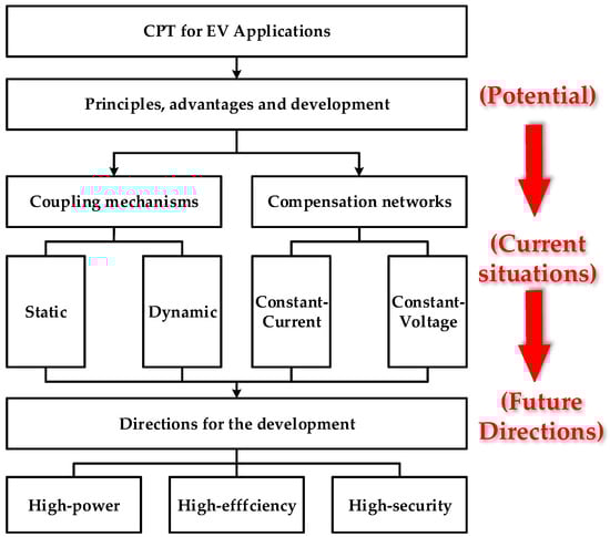 Electric Vehicles (EVs) are of great significance to the development and progress of the current era, as they have the potential to reduce pollution, alleviate the energy crisis, and reduce transportation costs [1,2,3,4]. Until now, EVs have almost always been powered by plug-in power supplies, which have many drawbacks. The first drawback is that plug-in power supplies have wear and tear problems, affecting their service life; the second is that the large-capacity batteries on the body add to their weight and cost [5,6,7,8]. These drawbacks greatly limit the further development of the EV industry. That is why the development of wireless power transfer for EVs, allowing electrical power to be transferred to EVs without contact, is crucial to the further development of EVs. Near-field wireless power transfer technologies can be classified into two types: Inductive Power Transfer (IPT) and Capacitive Power Transfer (CPT). IPT technology has been widely utilized in EV power transfer [9,10,11,12]. Despite this, the unavoidable problems of IPT technology, such as large size, high weight, and the presence of eddy current losses, make it difficult to achieve further development. The CPT system, however, with its low weight and size and negligible eddy current losses, has tremendous potential in the field of EV wireless power transfer. CPT technology has been regarded as only capable of transmitting small power with large losses for an extended period [13,14]. However, with the continuous deepening of research regarding CPT technology in recent years, especially the continuous development of high-power and high-efficiency CPT technology, the power level and efficiency of CPT systems have been significantly improved [15]. It is an essential potential solution for EV wireless power transfer. Almost all of the existing reviews on the field of EV wireless power transfer are mainly on IPT [16], with only a summary of CPT technology in the field of EV wireless power transfer [17,18,19]. At the same time, the existing review on CPT technology is mainly an overview of almost the whole field of CPT technology research [20], where the applications of this technology in the EV wireless power transfer field are only briefly summarised as one of the chapters [21,22]. In conclusion, in the existing literature, there is no general review of the application of CPT technology to EV wireless power transfer in a concrete and elaborate sense. This paper, being the first systematic and comprehensive review to summarise the application of CPT technology in the field of EV wireless power transfer, begins with the principle of CPT technology and introduces the potential of CPT technology for EV wireless power transfer field application and the history of its development. Different from the conventional CPT system, a CPT system suitable for EV wireless power transfer requires larger power transmission, so the coupling mechanism and resonance compensation network need to be improved. Therefore, this paper further discusses the coupling mechanism and resonance compensation network of a CPT system for EV wireless power transfer applications and provides a reference for CPT system selection. It is worth mentioning that IPT technology currently dominates the market, while CPT technology is still in the early stages of commercial adoption. For this reason, this paper analyses the existing challenges of current CPT technologies and eventually proposes solutions and development directions to overcome these challenges. The overall framework diagram of this paper is shown in Figure 1.