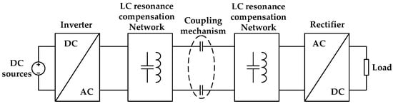 CPT technology uses a high-frequency electric field to transfer power contactlessly. Its structure is shown in Figure 2 [20,23,24]. Its principle is that the DC power is converted to high-frequency AC power by the inverter. It flows into the coupling mechanism through the original side LC compensation network. Under high-frequency and high-voltage AC power, the coupling mechanism’s primary and secondary coupling pole plates are equivalent to a set of flat capacitors. At the same time, an electric field is formed between them, which generates a “displacement current”, so the power is transferred from the coupling mechanism’s primary pole plates to the coupling mechanism’s secondary pole plates, thus enabling non-contact power transfer. After passing through the secondary LC compensation network and rectifier, it is converted into suitable power for the load [21,22,25].