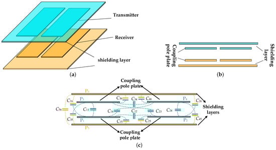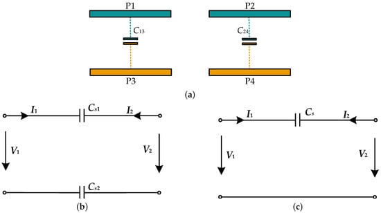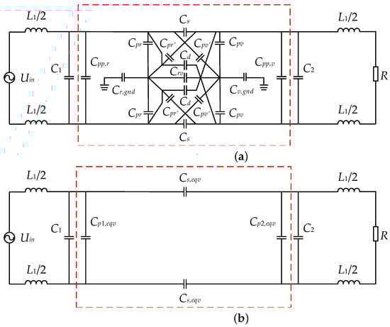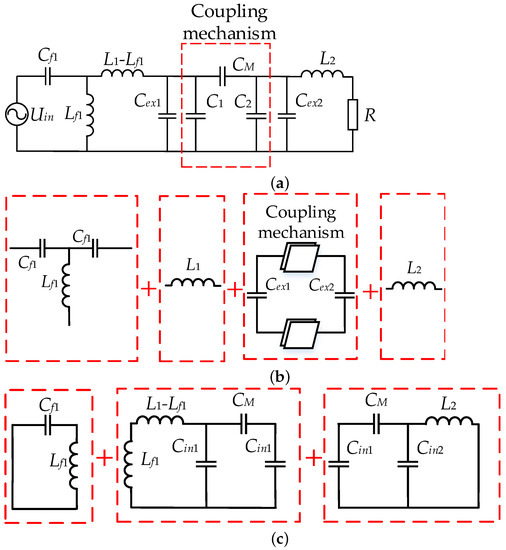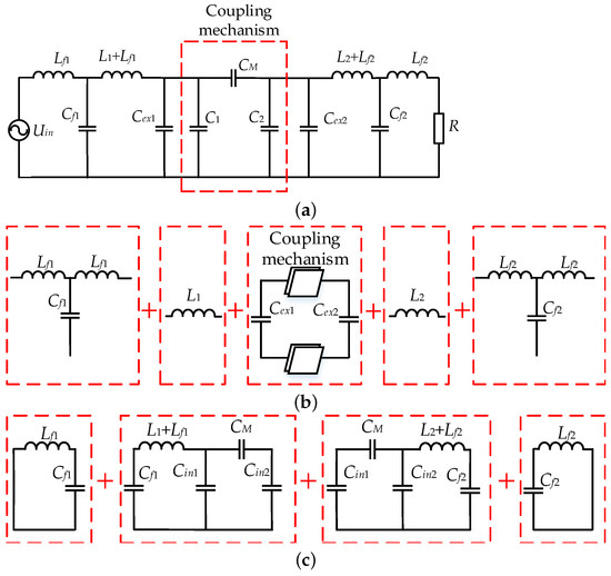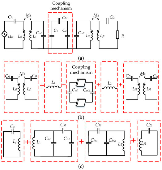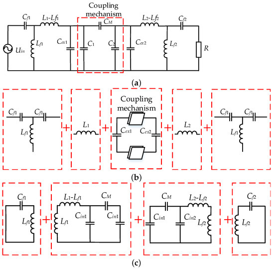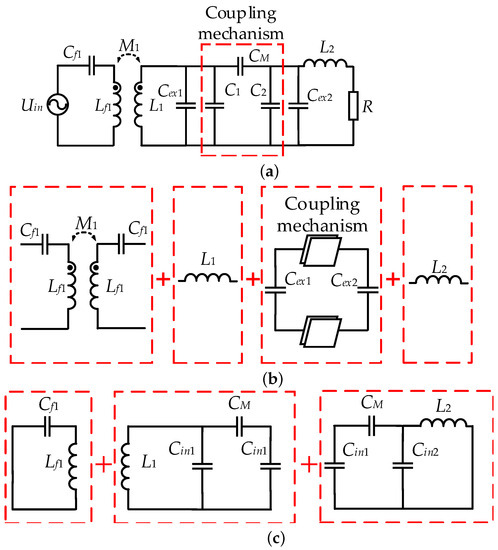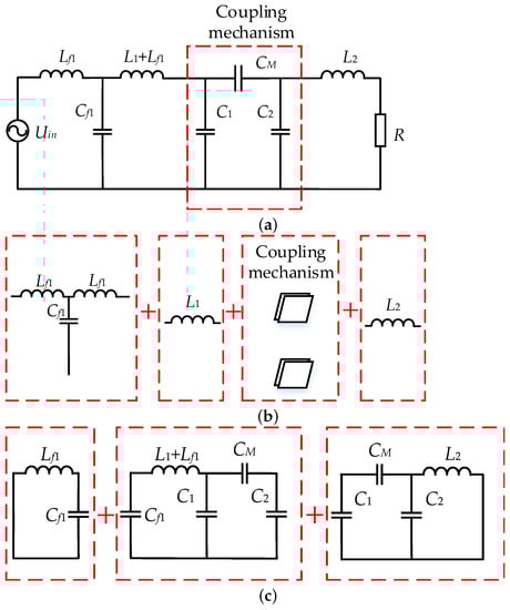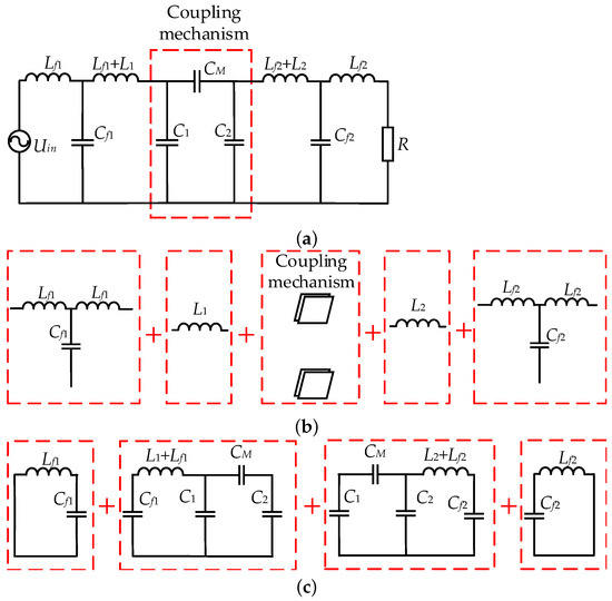 Figure 4 shows that the ideal CPT coupling mechanism equivalent model has only two coupling capacitances, one for power transfer and the other for power return [40]. These two equal coupling capacitances form a double-capacitance structure, as shown in Figure 4b. Considering that the two coupling capacitances are connected in series, they can be further equated to a single capacitance, as shown in Figure 4c.