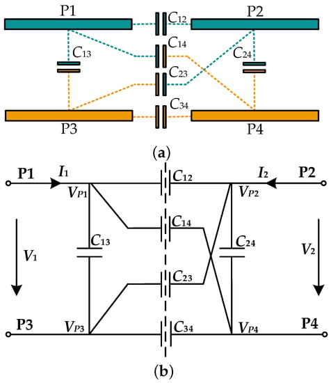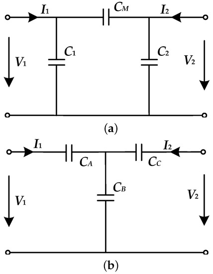 Using this two-port network model with six capacitances, the voltage–current relationship between the two sides can be represented as the combined effect of the self-capacitance and the mutual-capacitance. Additionally, the six-capacitance model can be converted into an equal network model composed of two self-capacitors and one mutual-capacitance using Equation (1) [41,42]. According to the T- conversion relationship, the -type equivalent model can be converted into a T-type equal network model according to Equation (2) [43], as shown in Figure 6.