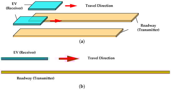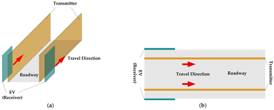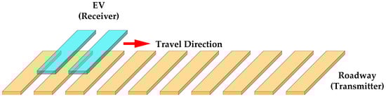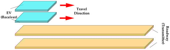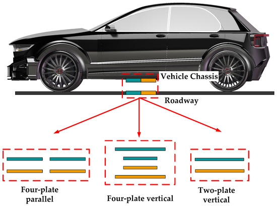 In the four-plate parallel structure, two transmitter plates are placed on the road in the same plane parallel to each other, and two receiver plates are placed at the chassis of the EV in the same way, as shown in Figure 9 [37]. In operation, one set of transmitter–receiver pole plates plays the role of power transfer, and the other set of transmitter–receiver pole plates plays the role of power return [46]. The advantage of this scheme is that the influence between the transmitter and receiver pole plates is small, and the cross-coupling capacitance between them is negligible, which is convenient for the subsequent modeling design. However, the parallel structure must occupy a large chassis area and have a significant electric field dissipation.
