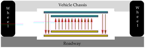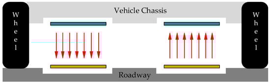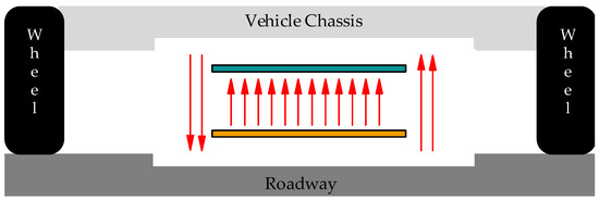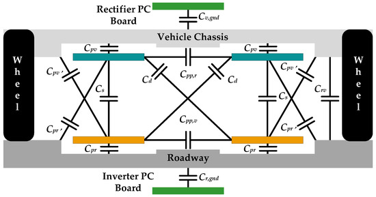 Based on the four-pole-plate vertical coupling mechanism, the two-plate vertical structure is formed by using the parasitic capacitance between the vehicle chassis and the roadway as a power circuit [49,50], as shown in Figure 11. Since only two pole plates are used as the coupling mechanism, this scheme reduces the overall cost of the coupling mechanism. Since the parasitic capacitance is used as the power transmission path, there is no need to analyze the parasitic capacitance influence for subsequent decoupling analysis [51]. However, compared with the coupling capacitance formed by using metal pole plates, the parasitic capacitance is more challenging to control because its value is more dependent on factors such as ground and chassis flatness, while the current flowing through the roadway will generate more significant losses and impact the power of the system.