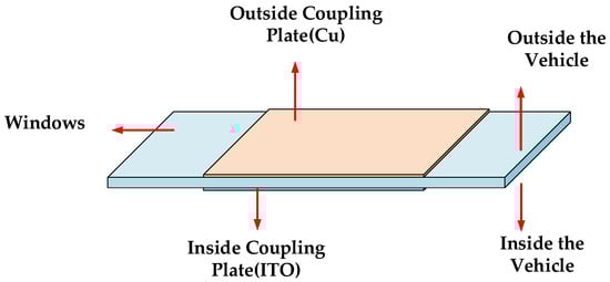 An EV window was used by a research team from Daegu University in 2016 to generate an eight nF coupling capacitance using a coupling pole plate with an area of 2400 cm2 and 2-mm-thick glass as a medium [52]. Following the research, in 2017 the research team at Daegu University proposed using an Indium Tin Oxide (ITO) transparent conductor instead of a conventional copper plate as a vehicle coupling pole plate [53], as shown in Figure 13. Consequently, the pole plate had better light transmission, so it did not have to be removed in a non-charging state to ensure light transmission in the vehicle. The advantage of using the window as the coupling medium is that it has a large surface area and is placed on the vehicle’s surface, making it easy to lay the coupling pole plate. It does not require any structural changes. However, during the charging process, there is a risk of scratching the window glass. At the same time, the transparent conductor ITO is carcinogenic to the human body, which limits its application.