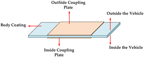 EV body insulation coatings include under coatings (which consist primarily of epoxy resin), intermediate coatings (which consist primarily of polyester), and top coatings (which consist primarily of polyurethane). In 2021, a research team at Utsunomiya University proposed using a body insulation coating as a coupling medium, attaching a metal plate inside the body as a power receiver, and attaching a metal pole plate at the hood and doors outside the vehicle as a power transmitter for power transfer, as shown in Figure 14. This equivalent capacitance of 20.6 nF was fabricated with a 250 mm × 250 mm coupling pole plate under an insulation coating with an additional 110 mm thickness [54].