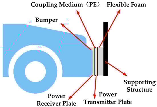 The coupling mechanism attached to the body surface of the EV to form the mode refers to the scheme of power transfer by placing the power receiver pole plate on the body surface and coupling it with the external power transmitter pole plate. It only requires the installation of a pole plate on the body to transmit power, not modification of the body structure. Moreover, the flexible structure enables the external transmitter pole plate to be tightly attached to the body, reducing power transfer distance and electric field dissipation, thereby allowing the coupling pole plate to be coupled with a sizeable equivalent capacitance without using a large area, as shown in Figure 16.