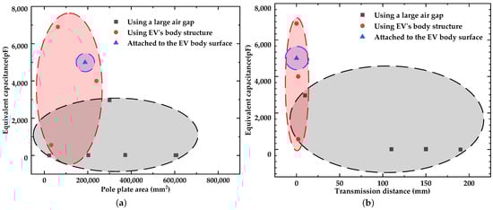 In 2015, a research team at the University of Wisconsin–Madison placed the receiver pole plate at the bumper of an EV, made a power transmitter pole plate with metal foil, and installed it at the transmitter mechanism with a 0.1 mm thick layer of PE material located on the surface of the metal foil as the coupling medium, and generated an equal coupling capacitance of 10 nF with only a 0.1 m2 area of the coupling pole plate [36,58].