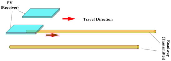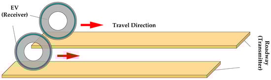In 2011, a research team from Toyohashi University of Science and Technology proposed a power transfer scheme using wheels as a medium, placing power receiver plates on the inner layer of the wheels, and placing power transmitter plates within the roadway [34,55,56], as shown in Figure 15, and in 2013 conducted experiments on a small electric toy car [35]. In 2016, the team modified the small EV wheel structure by embedding a power receiver pole plate at the car wheel and a power transmitter pole plate in the asphalt roadway to achieve 900 W power transmission [38,57]. The system also had a certain dynamic power transfer ability and could travel a distance of 4 m at a speed of 10 km/h [38].