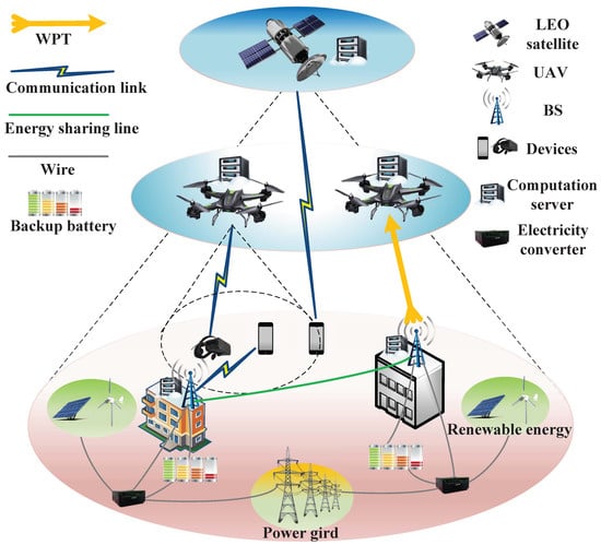 However, existing research efforts are limited to one or two aspects of the network in terms of reducing latency, energy saving, or access to new power supply technology. Relatively little attention has been paid to entire SAGIN with integrated energy access technology. Apart from the issues considered above, there are still a number of challenges associated with a SAGIN. First of all, the long-term performance of the network needs to be considered, as the arrival, transmission, and processing of tasks represent a stochastic and dynamic process over a period of time. The use of DRL in artificial intelligence techniques can address stochastic and complex problems, as well as dynamic problems. Secondly, due to the fact that future communication is likely to comprise a cellular network capable of providing energy [], it is extremely critical to power an unmanned aerial vehicle (UAV) in order to maintain the sustainability of the network. Fortunately, radio-signal-based wireless power transfer (WPT) can provide battery-equipped devices with a sustainable energy supply. For instance, the authors of [,,,] considered a wirelessly powered multiaccess network wherein a hybrid access point powers wireless devices via WPT.