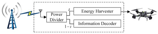 In order to maintain the sustainability of the network, the BS explores the WPT to power the UAV. Figure 2 shows the WPT principle adopted in the SAGIN. is the power division factor. The power divider divides the received radio signal into signal power with a ratio () for energy harvesting and signal power with a ratio for information decoding. In the energy harvester, the received signal is converted to the required energy and stored in the battery for the UAV.