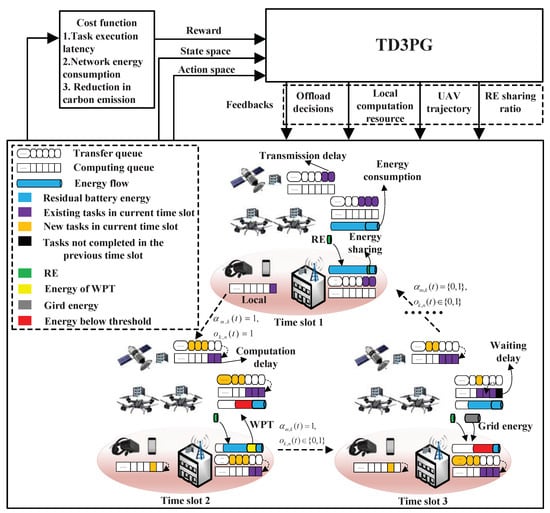 Figure 3 shows the strategic framework for the scenario proposed in the SAGIN. In time slot 1, tasks are set to be computed locally or be offloaded to the computation server without exceeding the latency constraints, incurring the latency of local computation or transmission, as well as the corresponding energy consumption. In time slot 2, tasks that are transferred to the server are computed. Because the device is within the communication range of the UAV, new tasks can be optionally offloaded to the computation servers, including the UAV waiting for execution. Since the UAV is also within the energy transmission coverage area of the BS, the BS can charge the UAV by WPT when the UAV battery power falls below a threshold. In time slot 3, the remaining tasks in the UAV’s computing queue that have not been computed (black) in the previous time slot generate a waiting delay. It is necessary to wait until execution is completed before calculating the tasks for the current time slot. At the end of each time slot, the remaining battery power is calculated. Excluding the energy that needs to be reserved, the BS backup battery shares the excess RE with other BSsin a certain percentage. When the remaining power of the BS backup battery is lower than the required reserved power (red), power from the grid is utilized to replenish it. In each time slot, the task execution latency, total network energy consumption, and reduction in carbon emissions are jointly formulated as a cost function. The reward state space and action space are fed into the TD3PG algorithm, which ultimately feeds back offload decisions, local computation resources, the UAV trajectory, and the RE sharing ratio for the scenario. Eventually, new actions are executed in the scenario.