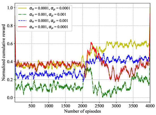 In order to evaluate the impact of different network parameters on the performance of the proposed TD3PG-based algorithm, a normalized cumulative reward is adopted. The normalized cumulative reward is defined as the ratio between the difference and the extreme difference in the cumulative reward, where the difference is the difference between the cumulative reward and the minimum cumulative reward. A larger normalized cumulative reward means better performance. In Figure 5, combinations of four learning rates are presented to evaluate the impact of different learning rates. With an increased number of episodes, the normalized cumulative reward value fluctuates with different learning rates. Until around 2000 episodes, the four cases of normalized cumulative reward have different convergence trends. The performance of the proposed algorithm is the best when and , corresponding to the highest convergence reward curve among the four cases.