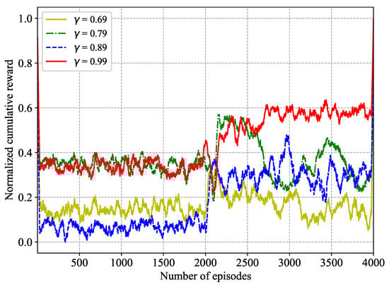 In Figure 6, the impacts of different discount factors are evaluated. According to the convergence results, the normalized cumulative reward in the four cases gradually become smaller as keeps increasing. In particular, compared with , , and , higher performance is exhibited when . Hence, is the best discount factor among the proposed discount factors.