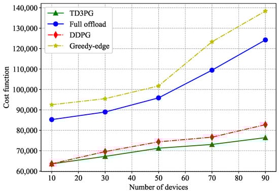Figure 7 shows the variation of the network cost function with the number of devices under different benchmark algorithms. Both the proposed algorithm and the DDPG algorithm demonstrate good performance in terms of joint latency-oriented energy consumption and carbon emissions. Specifically, for both algorithms, the value of the network cost function is always lower than other benchmarks for different numbers of devices and increases at a slow rate as the number of devices increases. This is due to the fact that the proposed algorithm and the DDPG algorithm dynamically adjust the offloading strategy to obtain a lower value of the cost function, optimizing the trajectory of the UAV and the sharing ratio of the RE in real time, ultimately obtaining a lower value of the cost function. In particular, the cost function under the TD3PG algorithm is lower and shows better performance compared to that under the DDPG algorithm.