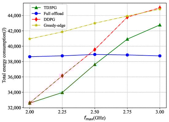 In Figure 8, with the exception of full offload, the total energy consumption under other benchmark strategies increases with the maximum computation capacity of the device. Due to the ability of the proposed algorithm and the DDPG algorithm to dynamically adjust the local computational resources according to the reward function, the total energy consumption achieves optimal performance when is low. In particular, the proposed algorithm shows the best performance with between 2.0 GHz and 2.5 GHz. However, the full offload policy offloads all tasks to the computation server with no significant change in total energy consumption.