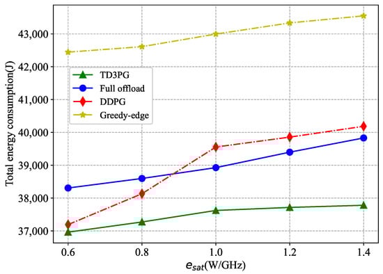 Figure 9 compares the variation of the total network energy consumption with different values of energy consumption per unit of computational resources for the LEO satellite under different benchmark algorithms. With the increase in , the total energy consumption under the proposed algorithm is always the lowest. The total energy consumption of the network under the greedy-edge algorithm is the highest. On the one hand, it makes no better offloading decision. On the other hand, in terms of energy consumption, the device is unable to intelligently change the computational resources, resulting in increased energy consumption for local computation. Under the full offload benchmark algorithm, more tasks are offloaded to the LEO satellite for execution. The total energy consumption grows more significantly when increases. The DDPG algorithm dynamically adjusts task offloading according to the reward value, with the rate of increase in total network energy consumption gradually decreasing as grows. The high altitude of the LEO satellite leads to increased transmission latency. Therefore, few tasks are offloaded to it. The variation in total network energy consumption with the proposed algorithm is slight when increases. Similarly, the proposed algorithm demonstrates excellent performance as the energy consumption per unit of computational resources for the UAV () increases.