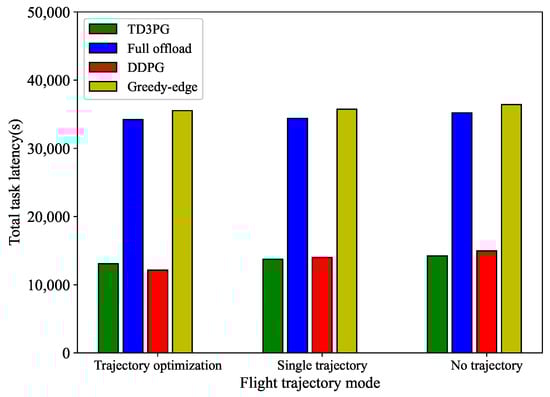 In order to illustrate the performance of the proposed algorithm in optimizing the UAV trajectory to reduce latency, three cases with different benchmark algorithms are analyzed. These three cases are trajectory optimization, the trajectory fixed in one direction, and the UAV flying in place. Simultaneously, 50 devices are compared in terms of total execution latency for all tasks throughout the entire period. As shown in Figure 10, the lowest overall latency of the three cases is trajectory optimization, which reduces the overall latency by 2.93% compared to the UAV flying in place and 5.78% compared to the overall time reduction for a trajectory fixed in one direction. The total task latency under both the proposed algorithm and the DDPG algorithm is lower in each flight trajectory mode, significantly improving the latency/QoS. With both algorithms, the UAV moves towards the location with the appropriate number of devices. As offloading too many tasks to the UAV leads to an increase in total latency, the greedy-edge and full offload algorithms show poor performance. The greedy-edge algorithm offloads a higher percentage of tasks to the UAV, resulting in a higher task latency. Meanwhile, the local computational resources do not correspond to the maximum computation capability, which leads to a longer computation time. This is the reason why the total task latency of the full offload algorithm is lower than the greedy-edge algorithm.