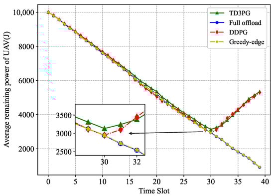 Since the UAVs have limited battery resources, the remaining power of the UAV needs to be maintained as much as possible to ensure the sustainable operation of the network. Figure 11 shows the average residual power of the UAV at each time slot for different benchmark algorithms. Among these benchmark algorithms, both the proposed algorithm and the DDPG algorithm employ WPT, which ensure that the UAV always has remaining power to maintain operation. However, the other two do not have WPT. So the power is quickly depleted and unable to maintain the sustainable operation of the network. It is worth noting that the energy consumed by UAV computation is not large compared to the energy consumed by UAV flight. Hence, the difference in the average remaining power of UAV under the remaining three benchmark algorithms is small. The greedy-edge algorithm and the full offload policy offload a large amount of tasks to the computation server. So the average remaining power of the UAV is lower. The proposed algorithm, on the other hand, integrates dynamic task offloading with UAV trajectory optimization, which not only maximizes the relative residual power of the UAV but also enables the UAV to replenish power through WPT when its power falls below a threshold value, maintaining sustainable network operation.